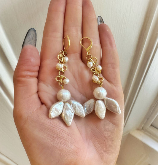 Art Nouveau Gold Pearl Dangle Earrings, Dainty Floral White Freshwater Pearl Earrings, Gold Vermeil Earrings, Bridal / Bridesmaid Jewelry
