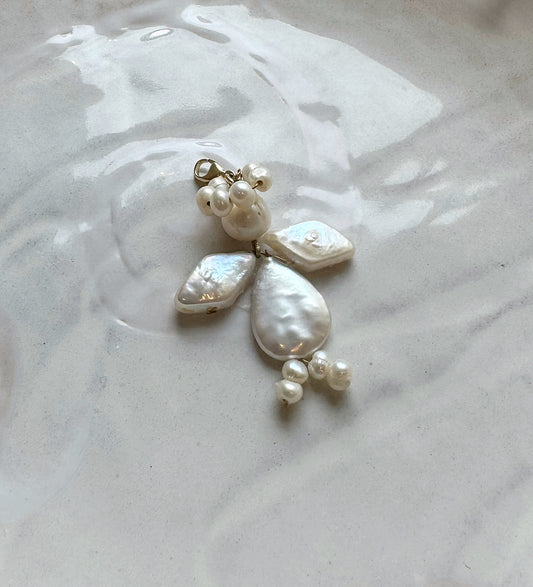 Cupid angel charm drop earrings, white freshwater pearl dangle earrings with fan detail, statement earrings, summer earrings