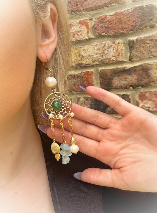 Boho Earrings, Dream Catcher Dangle Earrings, Statement Chandelier Earrings, Gold Drop Earrings, Boho Vacation Jewelry, Gemstone Jewelry