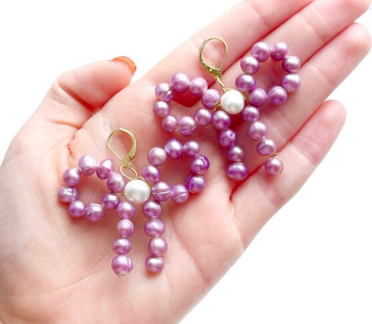 Bow Earrings Pearl Pink Earrings Gold, Freshwater Pearl Drop Earrings Colourful Dangle Statement Earrings, Cute Earrings Gifts for Her